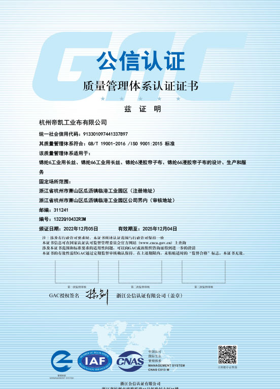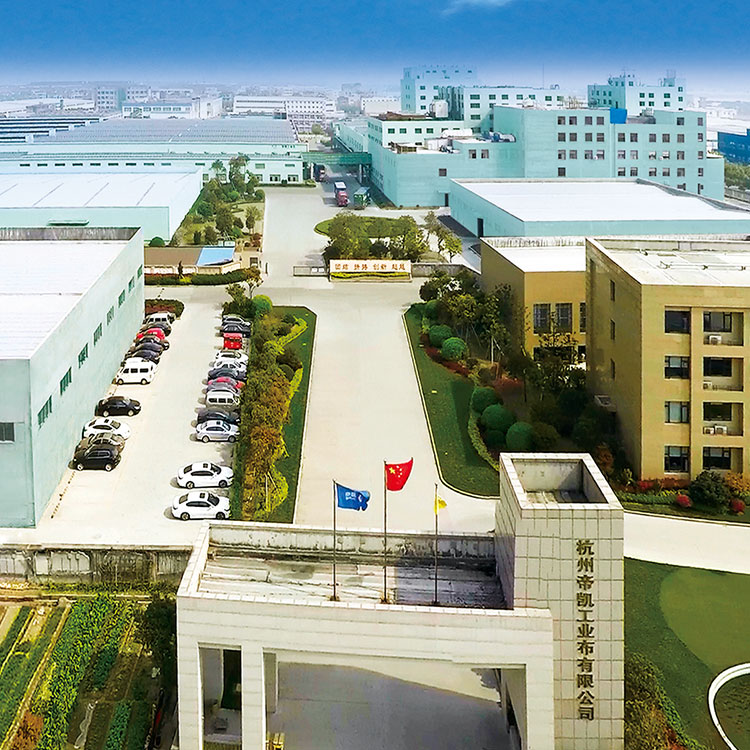 帝凯控股集团于2002年投资成立了杭州帝凯工业布有限公司,座落于杭州市萧山区瓜沥镇临港工业园区,是一家外向型、 专业化民营性质的化纤纺织企业,总资产额达近10亿元,员工330余人。多年来一直致力于工业尼龙6、尼龙66丝及帘子布 的研发与生产,并具有品种规格多元化等特点,可根据客户需求进行定制。帝凯本着“诚信立业,以人为本”的经营理念, 目前产品销售覆盖60多个国家及地区,包括欧洲、亚洲、美洲、非洲等。