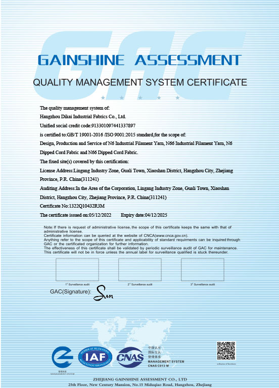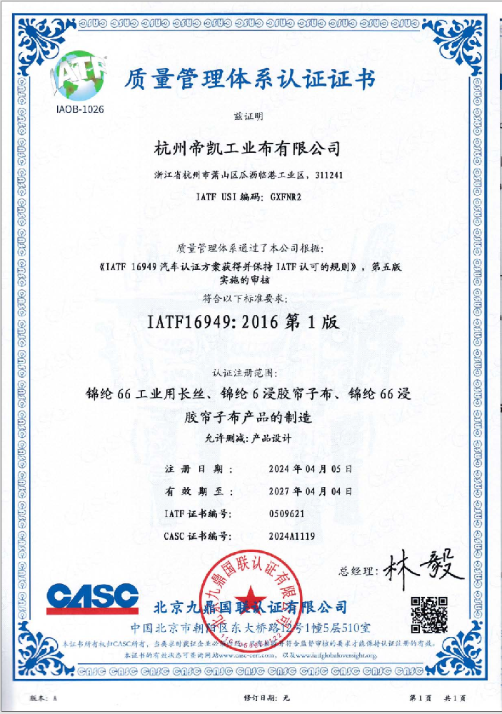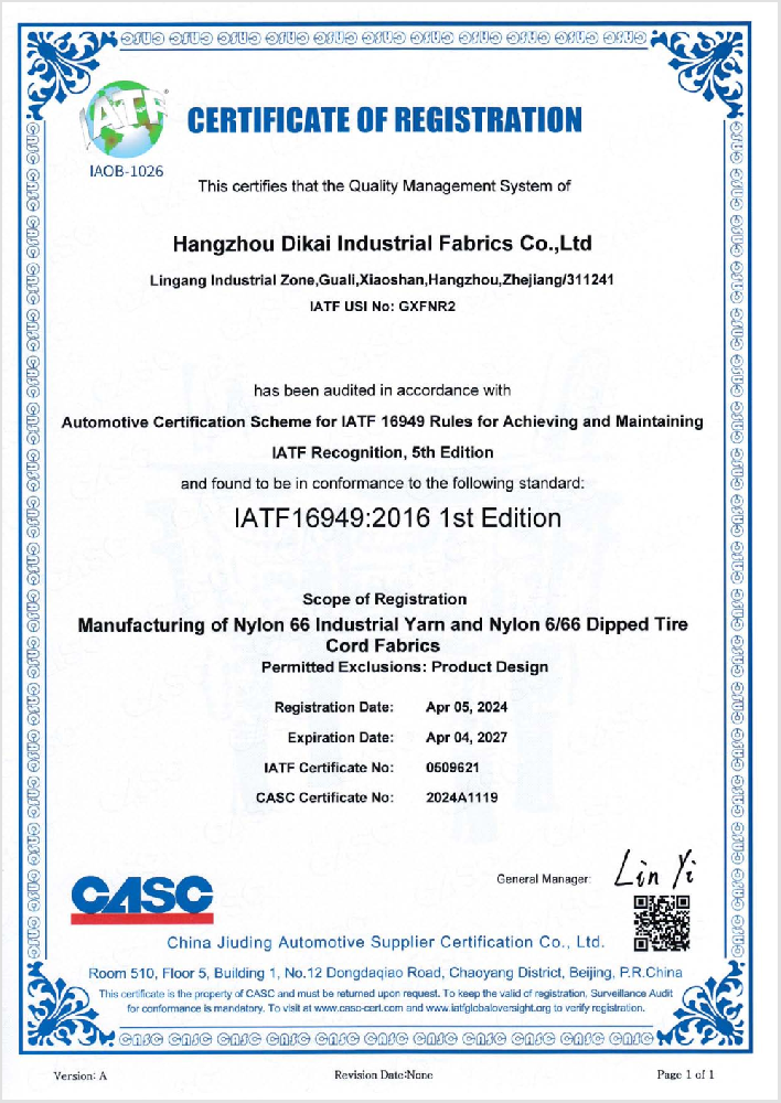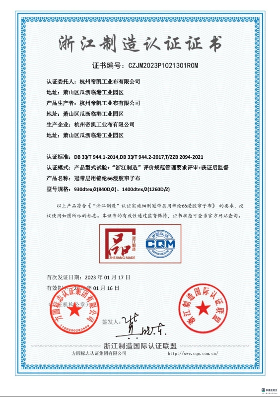 帝凯属于国内一流化纤纺织企业,具备先进成熟的上下游一体化配套的产业格局。包括,尼龙聚合、纺丝、捻线、织布、 浸胶及公用工程等形成的生产自动化流水线作业生产线。公司年生产规模7万吨,年实现销售收入13亿余元,年出口创汇 1.4亿余美元。公司先后获得“全国民营外贸500强”、“浙江出口名牌企业”、“杭州市外贸进出口百强企业”、“国家重点扶 持高新技术企业”等荣誉。公司具有完善的质量管理体系,质量管理、检验条件先进齐备,具有国家权威级别的质检中心, 2011年通过中国合格评定国家认可委员会实验室认可。