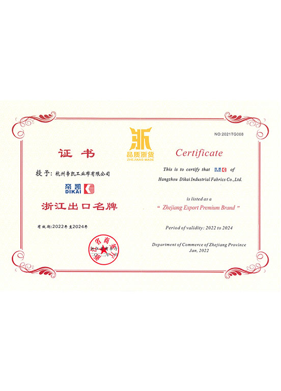同时公司分别通过了GB/T 19001-2016/ISO 9001:2015质量管理体系的认证、GB/T 24001-2016/ISO 14001:2015环境管理体系认证、GB/T45001-202/ISO45001:2018职业健康安全体系认证、CMS浙【2018】AA345号测量管理体系的认证和3A级标准化良好行为确认;2016年通过IATF-16949体系认证。连续荣获杭州市出口创汇“金龙奖”、杭州市外贸进出口百强企业,2011年被列入中国民营外贸500强;“帝凯”品牌被认定为省、市出口名牌企业。2015年被评定为国家高新技术企业。2017年和2018年被评为萧山区外贸出口20强企业。